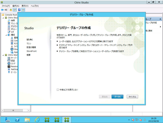 マシンカタログの作成が終わったら、次にどのユーサーにどういった仮想デスクトップ、もしくはアプリケーションを割り当てるか構成するために「デリバリーグループ」を定義する必要があります。次の手順に従ってデリバリーグループを作成します。