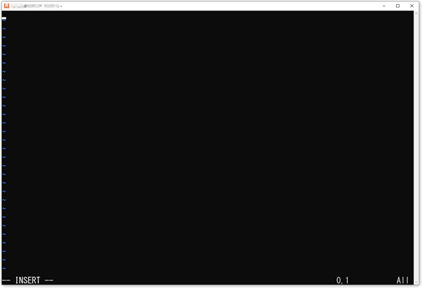 画面左上、1行目の1文字目にカーソルがある状態です。このカーソルの位置から文字列を入力しますので、「i」キーを押下します。すると、画面下部に -- INSERT -- と表示されました。