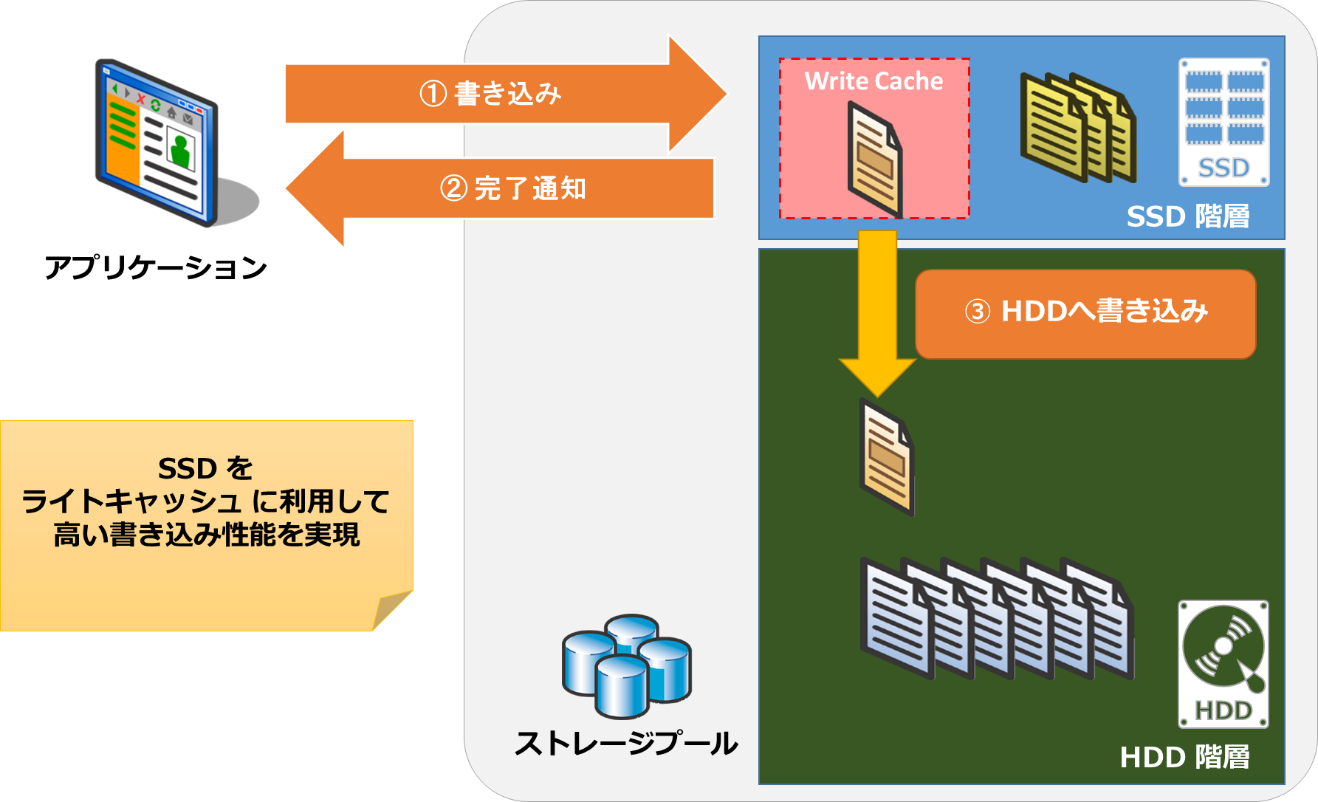 合わせて、ストレージのパフォーマンスを向上させるために投資されているのがWrite Back Cacheです。これはWindows Serverで階層化ストレージを作成した際に自動で設定されます。このWrite Back Cacheの機能は、SSDの一部を書き込みキャッシュとして利用するものです。Windows Server 2012 R2ではデフォルトで1GBの領域を書き込みキャッシュ領域として確保します。この機能によって、HDDが苦手なランダムIOの書き込みもキャッシュを利用して高速なレスポンスを実現できます。