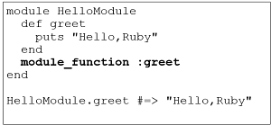 モジュールの定義において、「module_function」メソッドで指定されたメソッドは「モジュール関数」として扱われ、「モジュール名.メソッド名(引数)」で直接外部から呼び出すことができます。