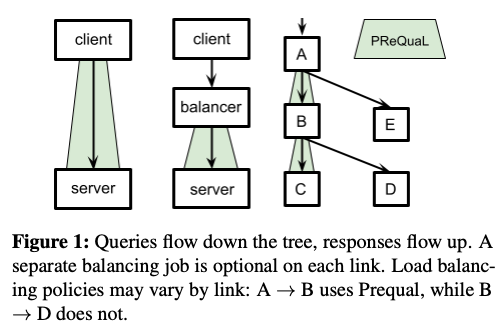 Prequalは、1つのシステムを構成する複数のマイクロサービス間でのロードバランシングに使用されるので、リクエストを送信するクライアントとそれを受けるサーバーの間に専用のロードバランサーを置くのではなく、クライアント側にロードバランシングの機能を持たせることも可能です。実環境では、図1のように両方の構成が使用されています。図1の左は、クライアントがPrequalのクライアント機能を持つ場合、図1の中央は、Prequalのクライアント機能を持ったロードバランサーを設置する場合になります。また、図1の右のように、マイクロサービスの処理がツリー状にブランチする場合、Prequalを使用する部分と使用しない部分が混在することもあります。