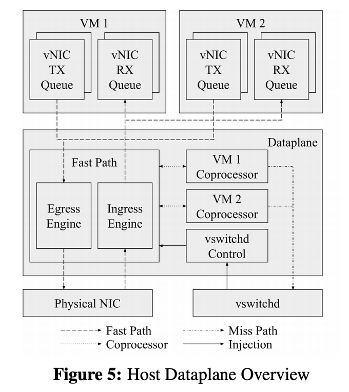 次に、図1の下半分にあるデータプレーンを説明します。図3は、データプレーンの詳細を示したもので、これを見ると、VMから送信されたパケットは、まずは「Fast Path」と呼ばれる経路を通る事がわかります。この部分の実態は、独自に機能拡張されたOpen vSwitchで、ホストOSのカーネルを経由せず、専用に予約されたCPU coreがダイレクトにパケットの処理を行います。