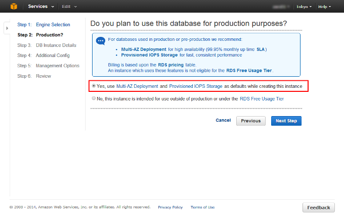 Production? で "Yes, use" を選択。(Multi-AZ DeploymentについてはMulti-AZ 配置を参照)