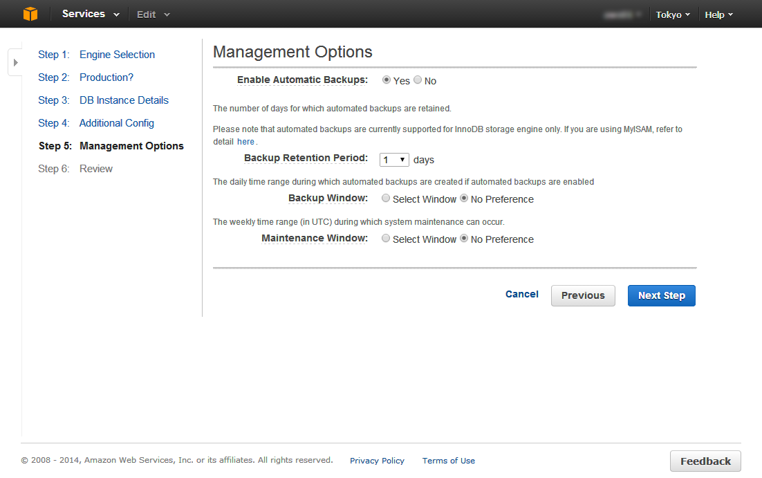 ここで示すのは一つの例です、その他の設定などの詳細については Amazon Relational Database Service ドキュメントをご確認ください。