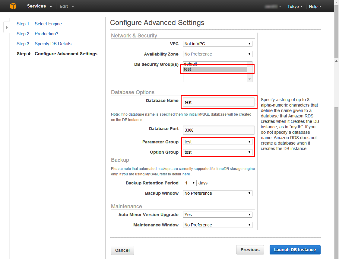 Configure Advanced Settings を設定、設定内容に問題なければ Launch DB Instance をクリックすると RDS が起動します。