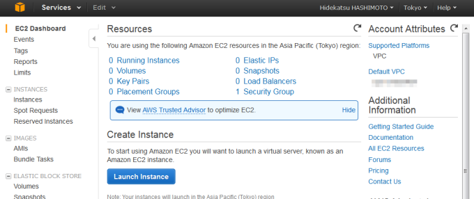 他のリージョンの状況を確認するには、画面右上のメニューでリージョンを切り替える必要があります。もし、作成したはずのインスタンスが見つからない場合には、目的のリージョンを正しく選択しているかを確認してみましょう。(本稿では、Asia Pacific (Tokyo) リージョンを使用しています)