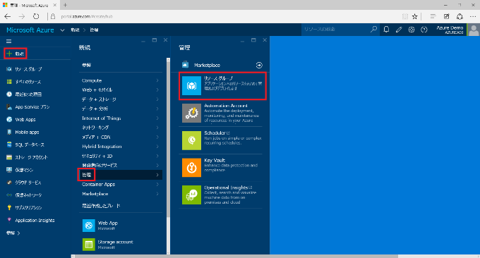 1) Azureプレビューポータル (https://portal.azure.com/) にアクセスして、ログインし、画面左上の [+新規] をクリックし、 [管理] > [リソースグループ] の順にクリックします。