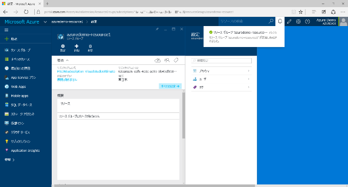 3) [リソースグループ azuredemo-resource1 が正常に作成されました] という通知が表示され、作成したリソースグループ (ここでは azuredemo-resource1) のブレード(内容を表示する画面) が表示されると、リソースグループの作成は完了です。