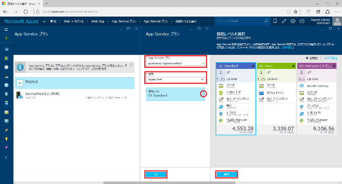 7) 任意の App Service プラン の名称 (ここでは azuredemo-AppServicePlan1) 、場所 は適切なデータセンター (ここでは Japan East) を選択し、価格レベルを選択します。ここでは [S1 Standard] を選択します。[選択] をクリックして価格レベルを確定した後、App Service プラン のブレードの [OK] をクリック、App Service プランの設定を完了します。
