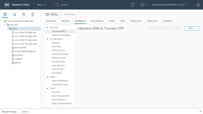 アップグレード準備の記事中にDRSを無効にしたので、再度有効にする必要があります。この作業を開始するには、クラスタを強調表示し、ConfigureタブをクリックしてvSphereのDRS設定を表示します。DRSを無効ではなくManual手動に設定していた場合は、そちらを変更する必要があります。